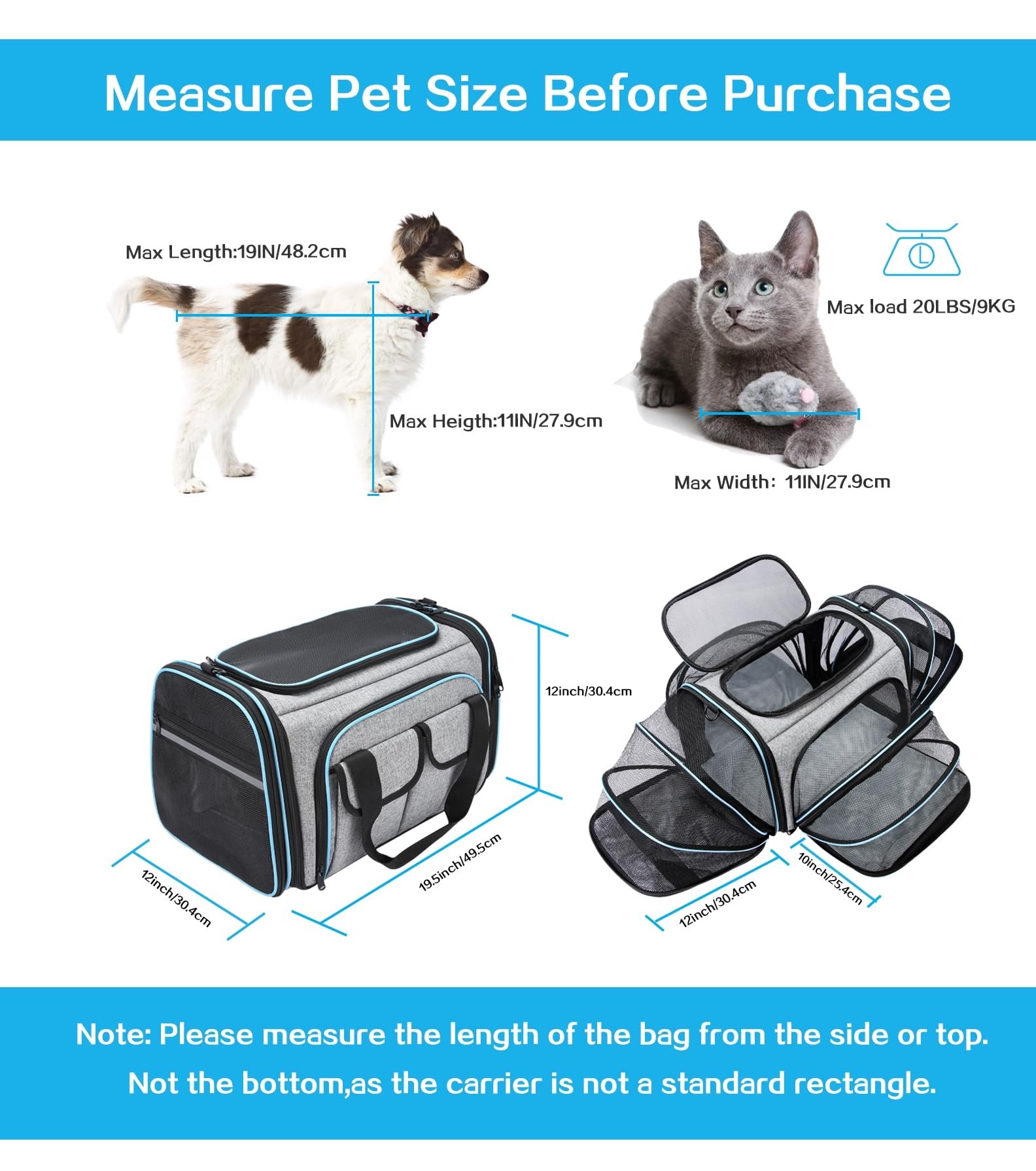 - Please measure your pet before purchasing: 19.5″L x 12″W x 12″H(43.5″L x 32″W x 12″H after the 4 expandable soft sided).Max load of 20 lbs (9 kg). Fits Pets up to 19″Lx11″H x 11″H.