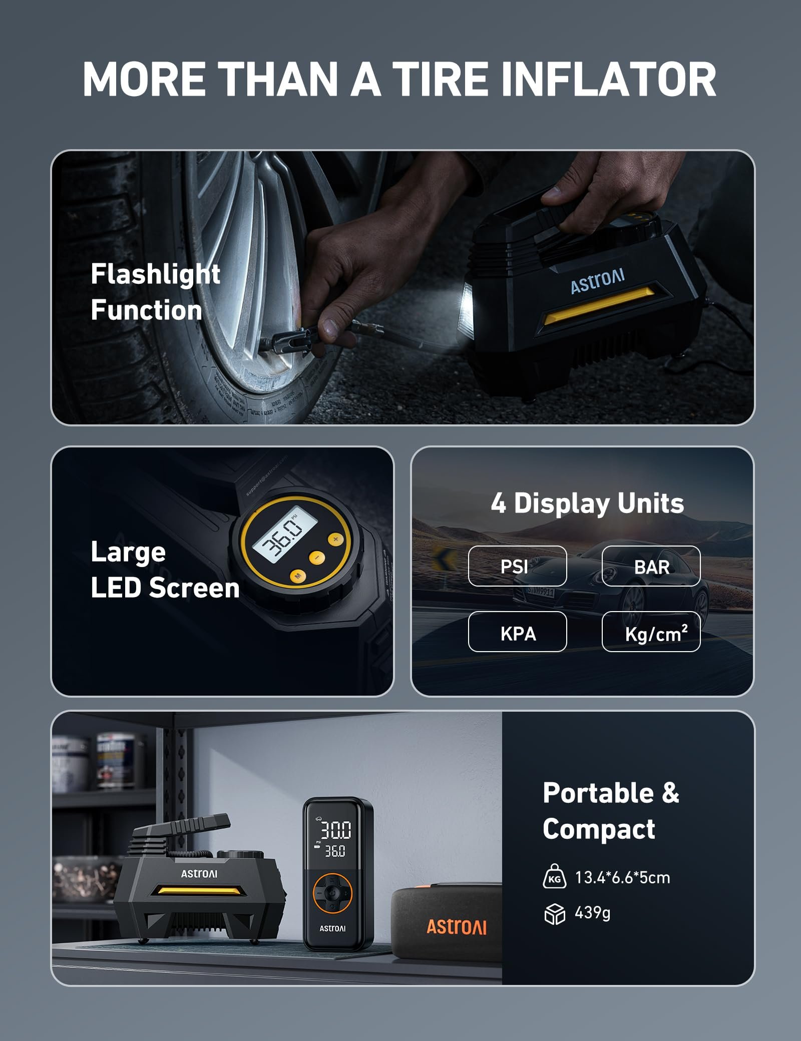 - TOUGHULTRA TECHNOLOGY, ENHANCED DURABILITY: This tire inflator is manufactured with AstroAI’s unique ToughUltra technology, so all of its core parts, including its cylinder, motor gears, and connection rod, are built using a powder metallurgy integrated molding technique. This revolutionary manufacturing process greatly enhances the inflator’s durability and increases its service life by 50%.