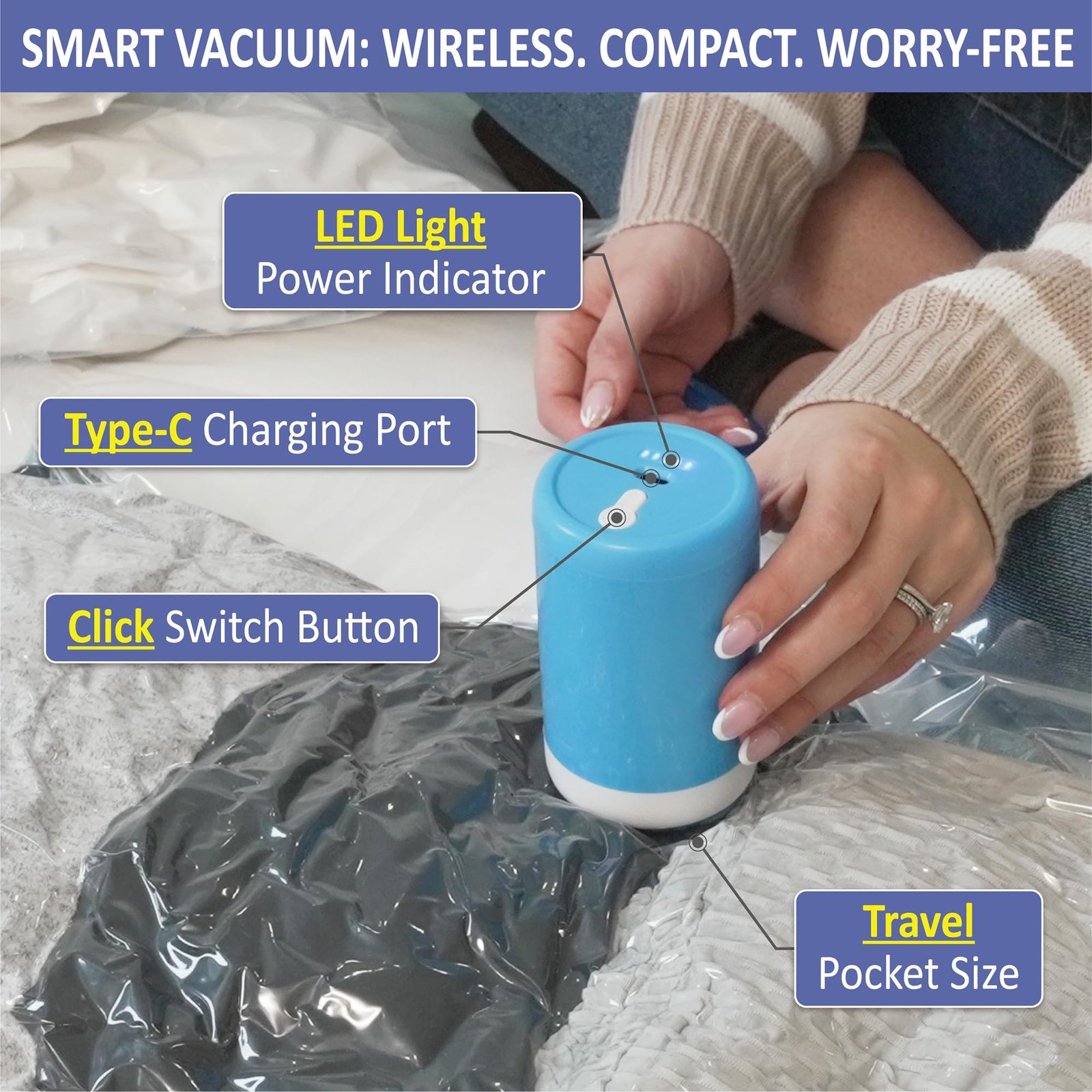 - Rechargeable Wireless Air Pump for Fast & Powerful Compression: Our game-changing rechargeable air pump delivers strong suction that removes air from clothes, sweaters, even coats and quilts in just 10–30 seconds. Compact and portable, travel-friendly design that fits your suitcases, backpacks, and carry-ons. USB charging with Type-C plug via laptop or power bank ensures worldwide compatibility, and compresses up to 90 bags per charge.