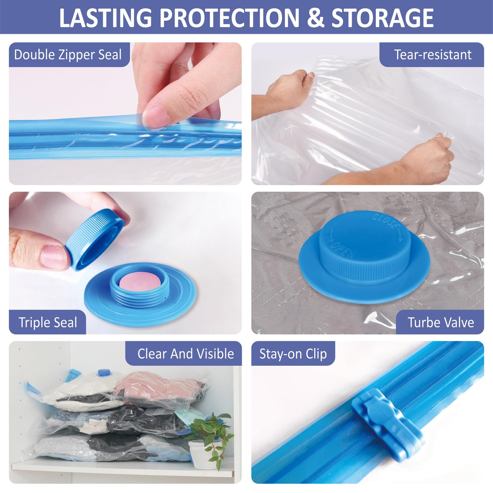 - Reliable, Long-Lasting Protection: Each vacuum bag features a triple-seal turbo valve and double-zip seal that securely locks out air during compression and maintains a tight seal over time. The robust PA+PE material protects your items from dirt, dust, and damage, ideal for travel, closet organization, or basement storage. Can be used repeatedly.
