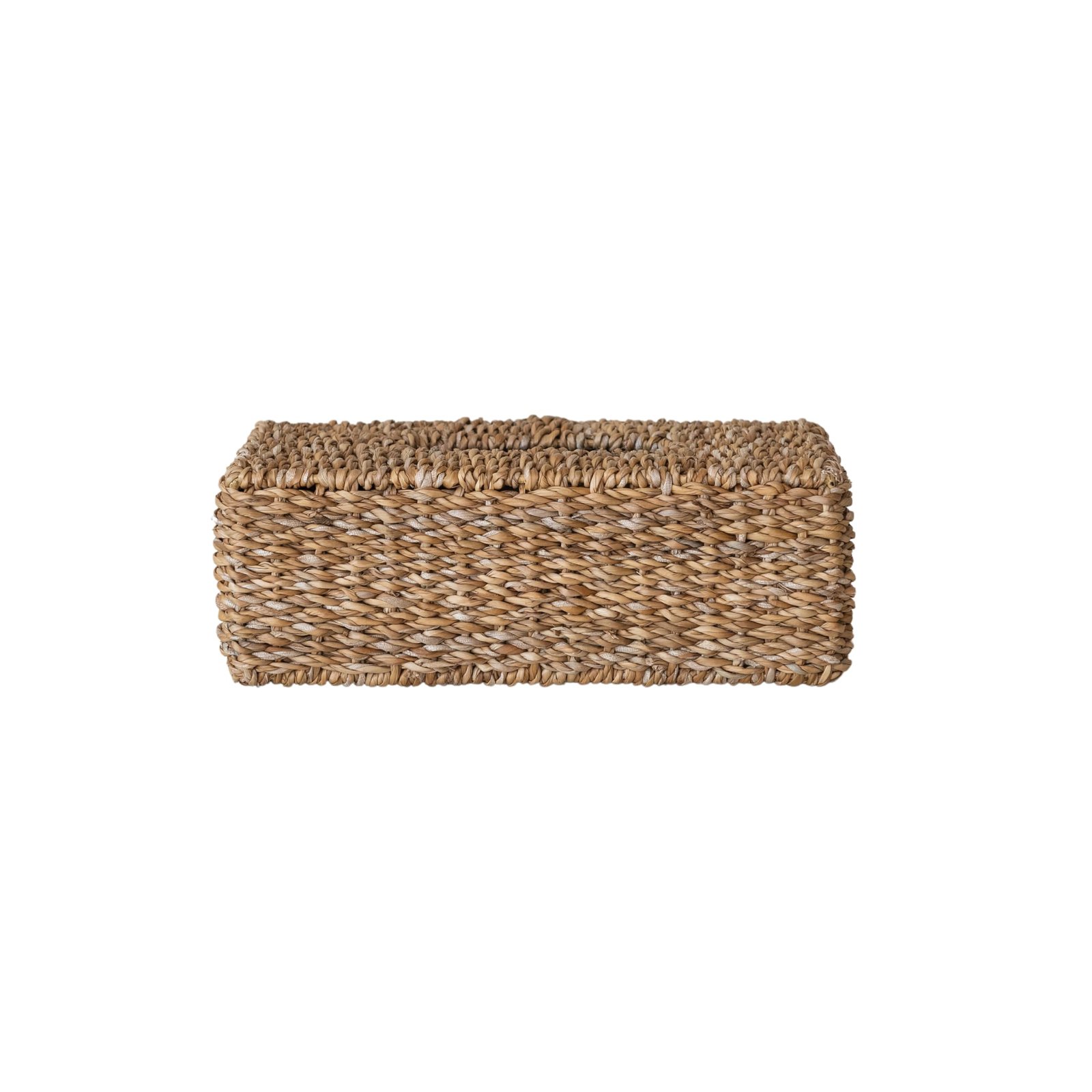 - A charming tissue box cover featuring a hand-woven seagrass design in a natural finish