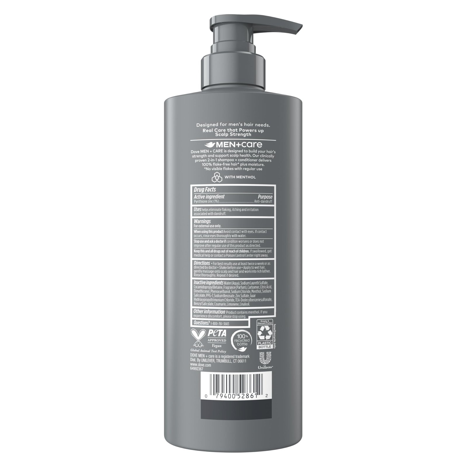 Details: Say bye to dandruff, say hi to freshness. Dove MEN+Care Shampoo + Conditioner Dandruff Defense is the perfect solution for men who want to simplify their hair care routine. Embrace the simplicity of a 2-in-1 product that provides essential protection to your scalp and care to your hair. We understand the unique needs of men’s hair, and this product is specifically designed to meet those needs. Formulated to build your hair’s strength and support scalp health, Dove MEN+Care can make a noticeable difference in just a short time. Our clinically proven formula, enriched with Pyrithione Zinc, delivers 100% flake-free hair and ensures your scalp stays moisturized, so you won’t see any visible flakes. For an added refreshing touch, Dove MEN+Care Dandruff Defense is enriched with menthol, keeping your hair and scalp feeling cool and fresh. To take your hair care to the next level, consider using other products from the Dove line, such as the conditioner and hydration serum. Enjoy the benefits of these high-quality, effective products, all of which are certified as vegan and PETA-Approved, ensuring that you can maintain a healthy, dandruff-free scalp while also being kind to the environment. Now let’s keep your head cool and protected!