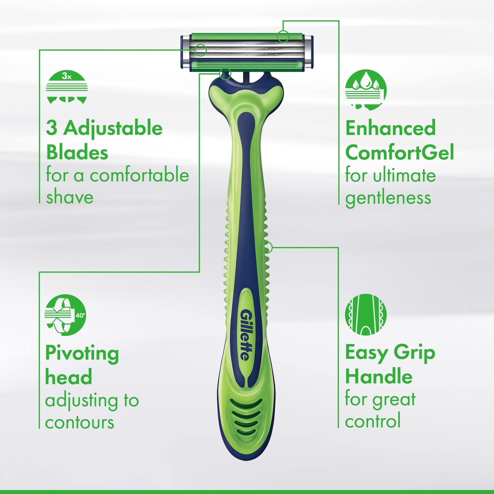 - Enhanced Lubrastrip with water-activated Comfortgel technology for ultra gentle shaving