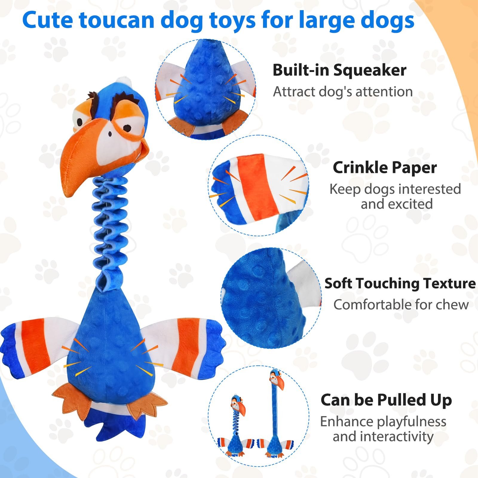 • Fun-Filled Squeaky Dog Toys with Crinkle Paper:Our plush dog toy is designed as a charming toucan, with a unique long neck and an elastic band to give it a lively and fun look.Our dog toy has a squeaker in the head and crinkle paper inside the wings and tail that catches pets’ attention,make chewing more exciting.Treat your dogs to our dog squeaky toys packed. Guaranteeing hours of stimulating playtime for your furry friends