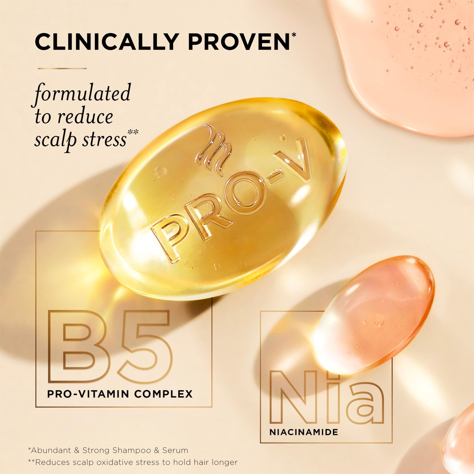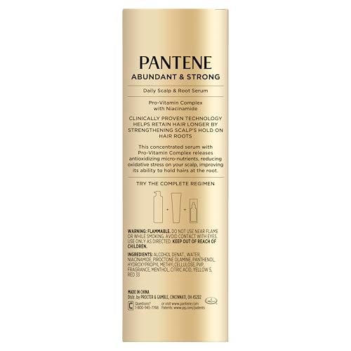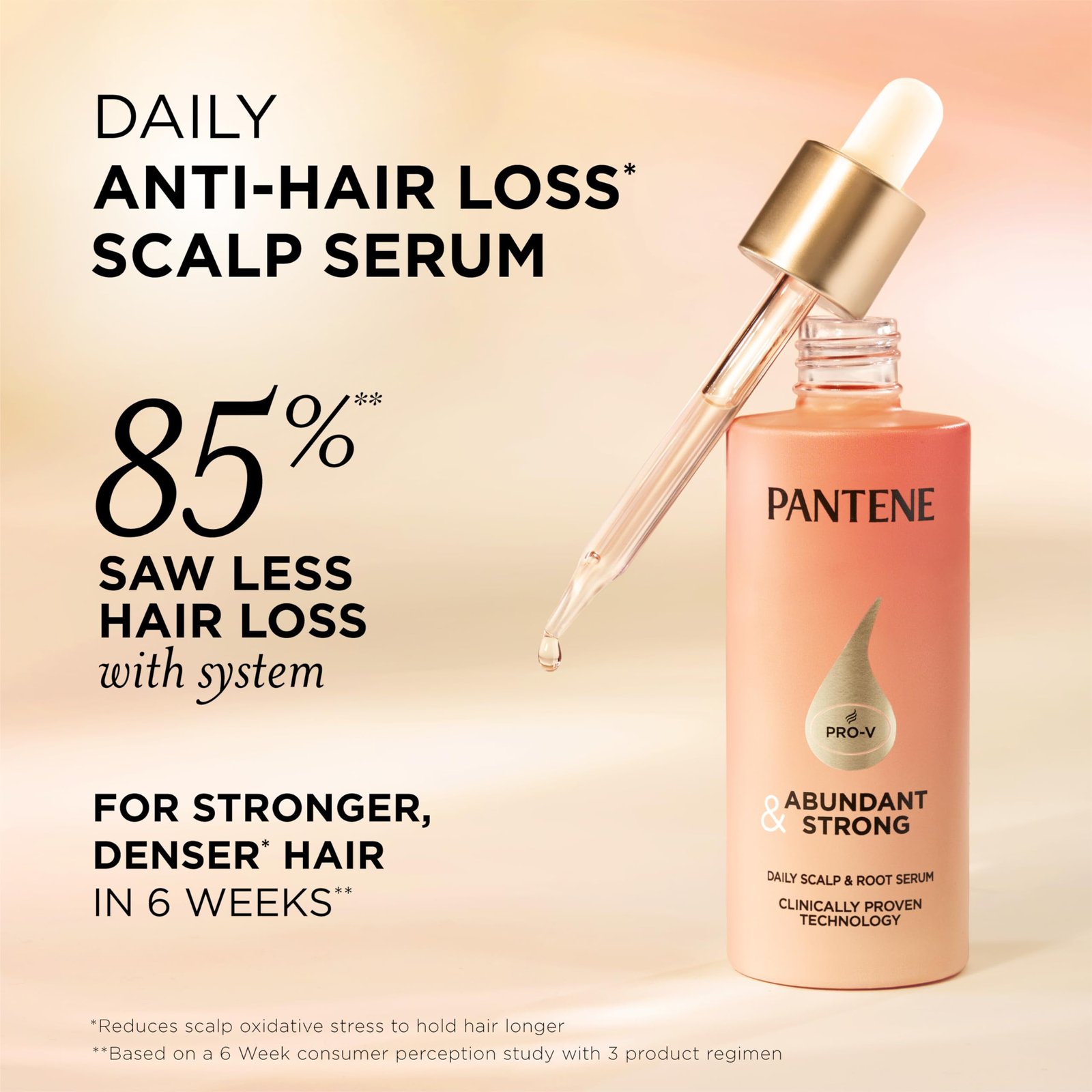 Details: SUPPORT STARTS AT THE SCALP Pantene Abundant & Strong Scalp & Root Anti-Hair Loss* Serum is a targeted daily treatment designed to help reduce hair loss* by strengthening your scalp’s hold on hair at the root. Formulated with the Pro-Vitamin B5 Complex and Niacinamide, this clinically proven technology helps retain hair longer by reducing scalp oxidative stress — a key contributor to weakened roots. Hair loss can feel overwhelming, but our daily regimen empowers you to take control. Clinically proven technology with Pro-Vitamin B5 Complex and Niacinamide**, the Pantene Abundant & Strong 3 Step Anti-Hair Loss* System strengthens the scalp’s hold on hair at the root. With a shampoo, conditioner, and root & scalp serum, this system targets two major causes of hair loss: breakage and shedding. • Gentle Cleansing: The shampoo cleanses while reducing oxidative stress on the scalp, strengthening scalp’s hold on hair roots. • Strengthening Conditioner: Reinforces each strand’s structure, improving resistance to daily damage and promoting fuller-looking hair. • Targeted Scalp Support: The lightweight, non-greasy serum provides focused nourishment to the scalp, addressing the root causes of hair fall. This system is effective for all hair types, making it a versatile solution to prevent hair fall and repair damaged hair. VISIBLE RESULTS, REAL RELIEF What to expect with daily system use: 1st use: Visibly thicker hair. 4 weeks: 85% less hair loss due to breakage. 8 weeks: 6,000 more strands were retained at the root. HOW TO USE Step 1: Massage shampoo into wet hair. Rinse thoroughly. Step 2: Apply conditioner generously, leave on 1–3 minutes, then rinse. Step 3: Use Serum daily on wet or dry hair. Part hair into 4-5 sections. Apply one full dropper per section on the scalp line. Massage through scalp & roots. Do not rinse. Blow dry for an instant root lift. As you apply the serum, you will experience a cooling sensation on your scalp, helping to ensure full coverage so no spot is missed. *Shampoo & Serum reduces scalp oxidative stress to hold hair longer. Conditioner reduces hair loss due to breakage. **shampoo & serum