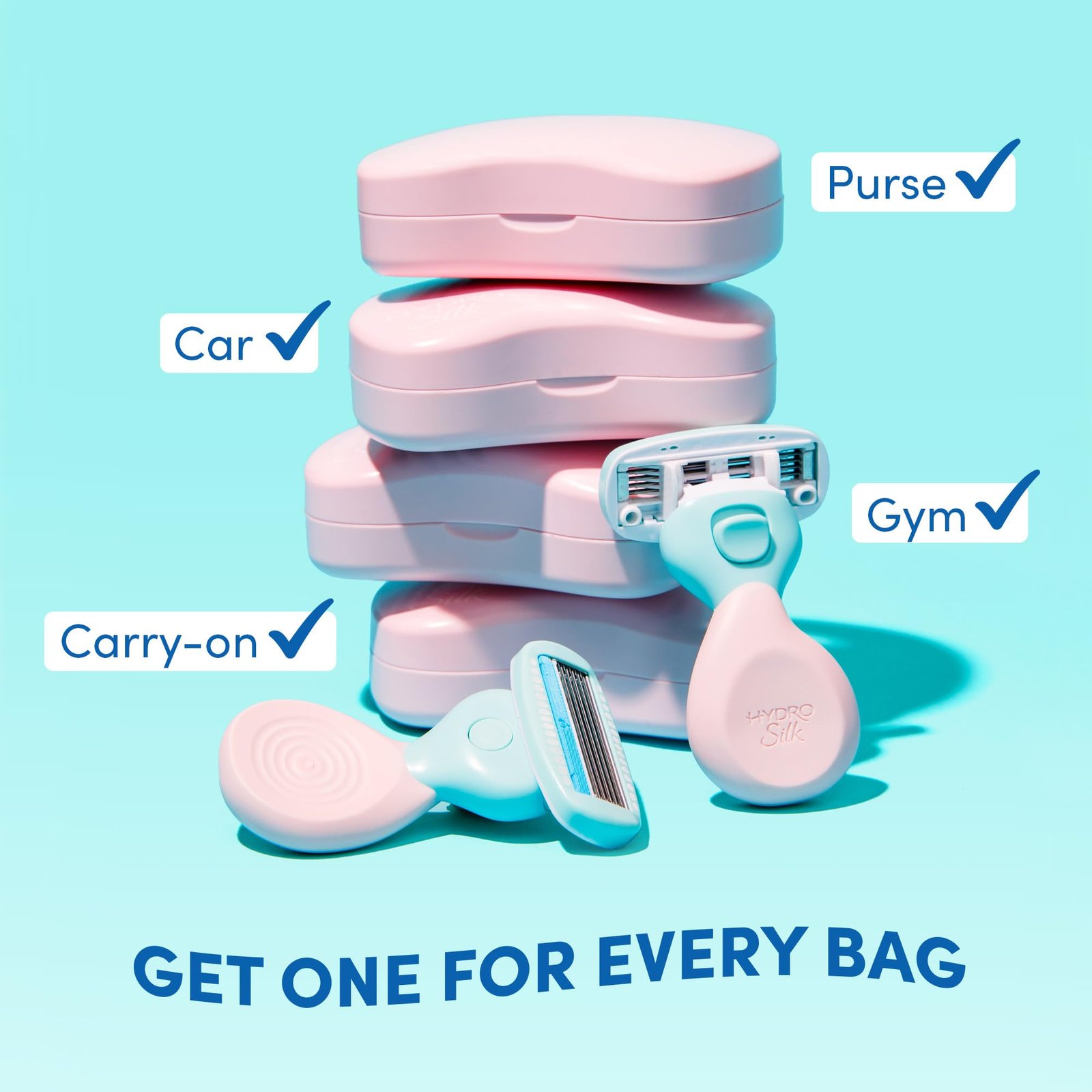 Details: Schick Hydro Silk 5 blade razors for women now come in mini! Our newest women’s razor is compact, lightweight, and perfectly designed for life on the move. Whether it’s in your purse, gym bag, carry-on, or shower, this shaver for women is made to fit your routine – wherever it takes you. With 5 Curve Sensing blades and water-activated Hydra-Boost Serum, it will quickly earn its spot among your favorite women’s razors. When it’s time to switch blades, just pop on any Schick Hydro Silk refill and toss it back in your bag. One refill lasts up to 32 days (based on shaving 3.4x/week). With a clever dual-purpose case that doubles as a shower stand, it’s just one more reason these have become mini travel essentials for women. Because there’s smooth, then there’s Schick Hydro Silk. Descubre nuestra nueva mini afeitadora para mujer: compacta y ligera, es perfecta para llevar en la cartera, en el auto, a el gimnasio o a donde sea que te lleve el día. Un excelente rastrillo de viaje para mujeres, su estuche también funciona como soporte en la ducha, ideal para usar en casa o mientras viajas.