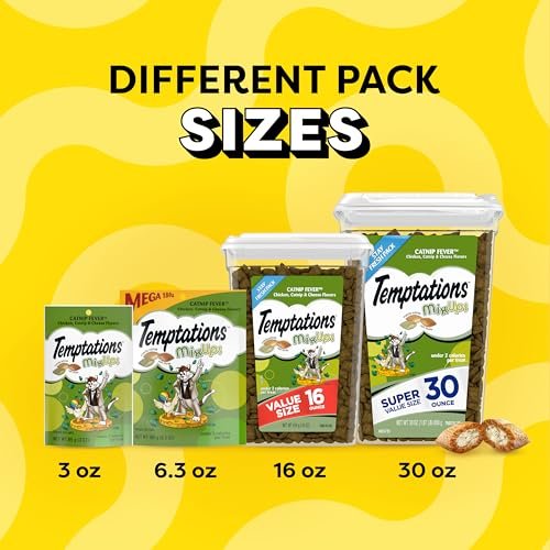 Details: Cats love the delicious, crunchy taste of Temptations Catnip Fever Flavor treats, so give your feline the purr-worthy Temptations crunchy catnip treats, and they’ll come running the moment you open the cat treats crunchy snack pack. Each bite has less than 2 calories and is an irresistible dual-texture treat that is crunchy on the outside and soft on the inside, ideal snack in a daily routine. The stay-fresh tub lets pet parents and cat owners keep the chewy cat treats ready when it’s feeding time and sealed tight when it’s not. Temptations treats for cats slide naturally into a regular routine: serve as a reward, a meal, or sprinkle as a cat food topper. Temptations Cat Treats remain the perfect way to show your feline friend just how much you care while giving them nutritious rewards.